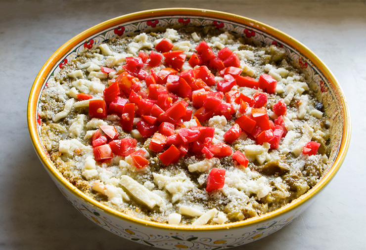- Spoon the tomatoes into the center of the sformato, then bake for 35 to 40 minutes until the sformato is set, and the cheese is bubbly and beginning to brown. Rest 10 to 15 minutes before serving.
