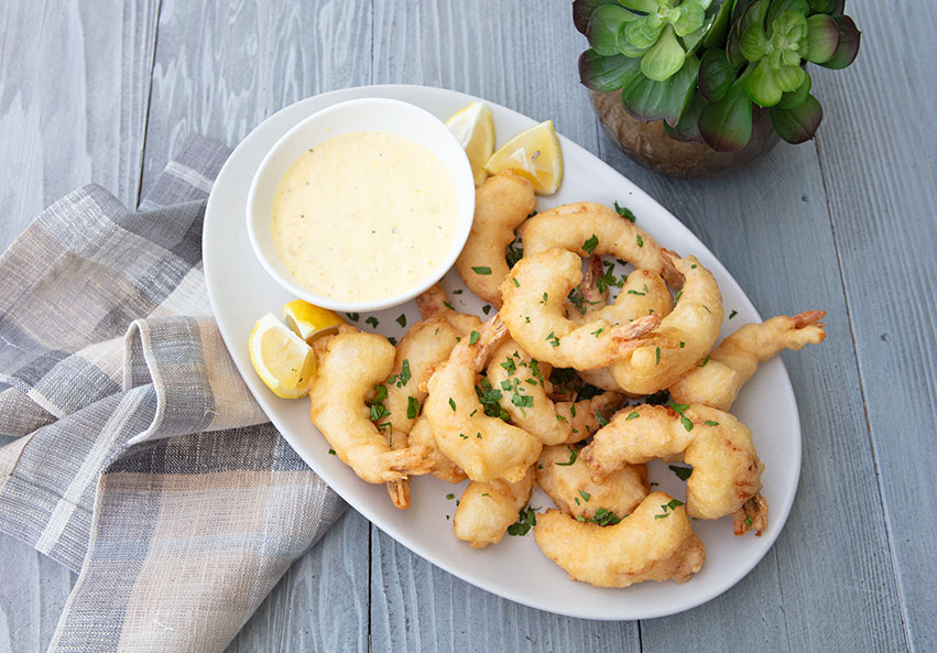 Crisp, lightly battered shrimp are served with a vibrant lemon dip.