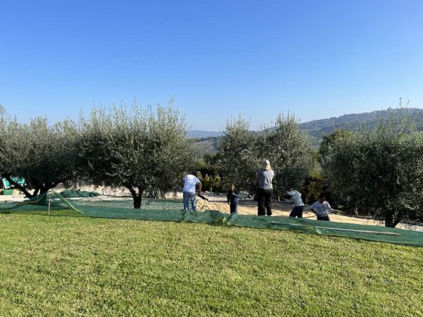 This year, we had lots of help harvesting our olives as family members traveled to Umbria from the US and Canada to give us a hand. It is good because we had a great year, with more olives than usual to pick. In addition, the weather couldn’t have been better for the harvest, with temperatures in the mid-seventies each day. It took us three days to pick all our olives, and although we had one foggy morning start, the other two days were perfect. After three days of hard work, we ended up with 2,000 pounds of olives, just under 100 liters after they were pressed at the mill. The oil was especially tasty this year, and our neighboring farms were also happy with the quantity and quality of this year’s olives.