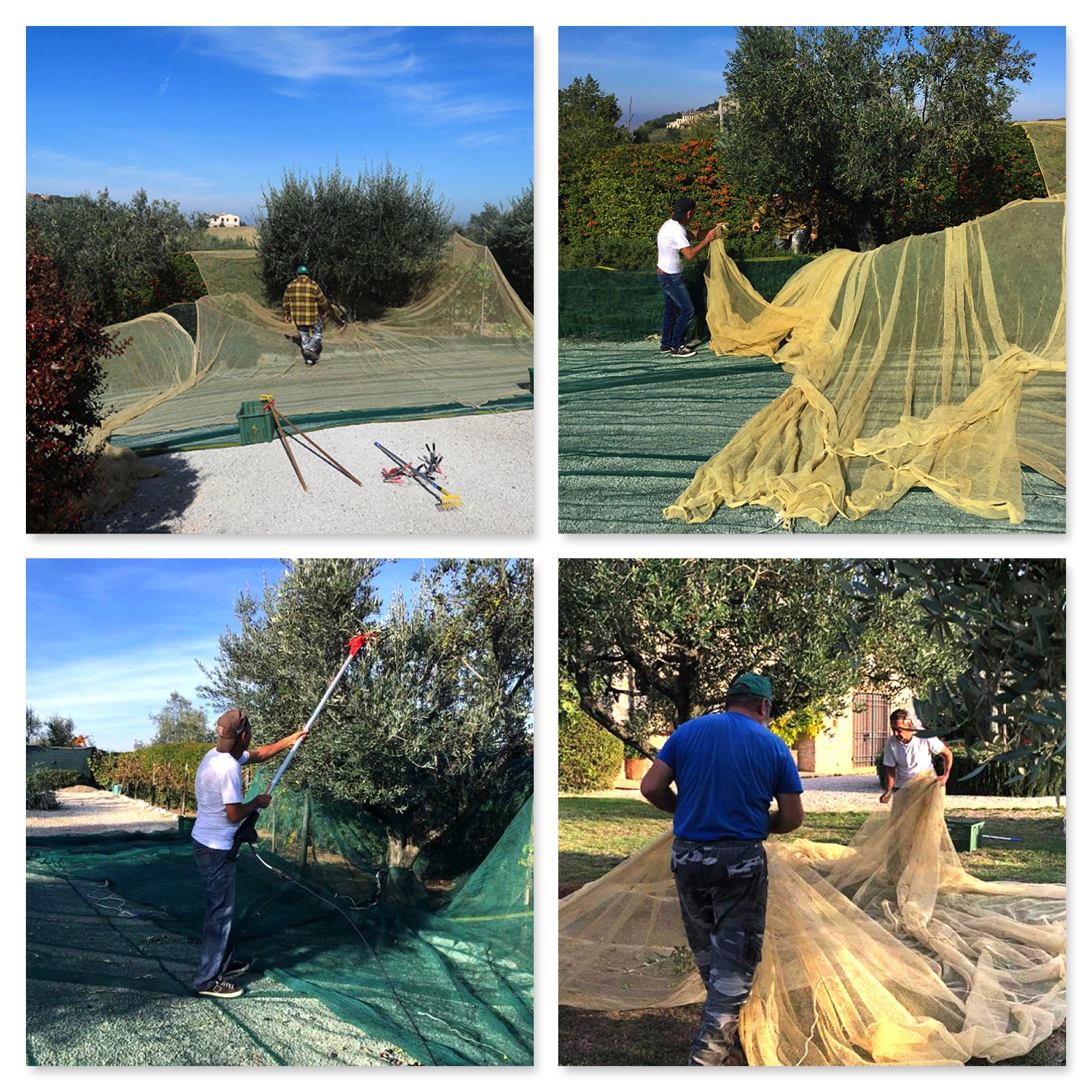 Proper placement of the nets is one of the most important aspects of the harvest as you do not want to lose any olives. A lot of our trees are on slopes, so having an expert like our handyman Gino set the nets is very helpful.