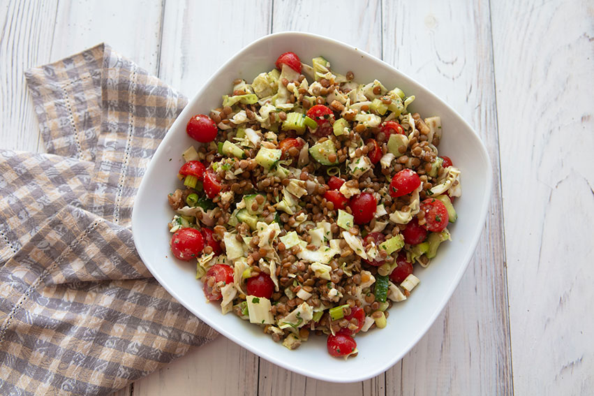 When lentils are done, strain and add to a large serving bowl with cabbage, tomatoes, cucumbers, and green onions.