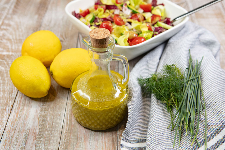 You can use any fresh herbs you prefer in this dressing. I used dill and chives, but mint, parsley, and basil are also good choices. Wash the lemons thoroughly before use, and opt for a high-quality extra-virgin olive oil. I used our own oil that we harvest every fall at our Umbrian farmhouse, so my dressing is quite green. If you use a lighter oil, your vinaigrette will also be lighter. I love the vibrancy of this vinaigrette, but if you find it too “lemony,” you can add a spoonful of honey to the dressing to tame it just a tad.