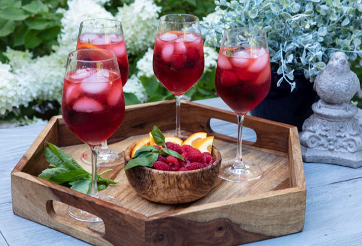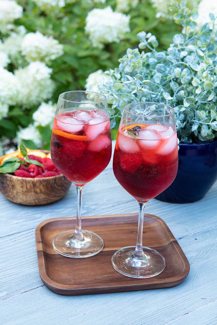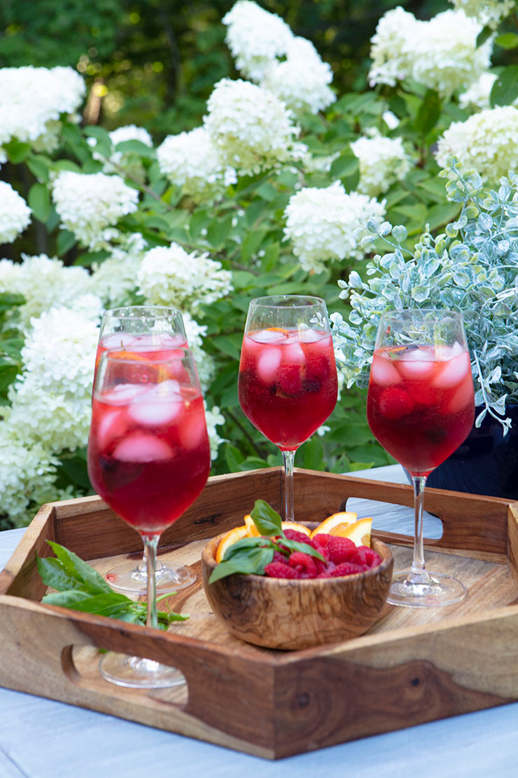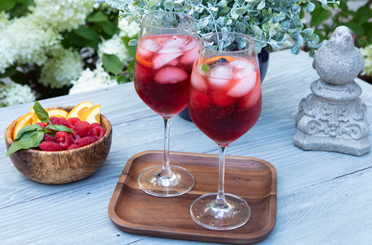 - Garnish each of the glasses with a thin slice of orange, a few fresh berries, and a fresh basil leaf.