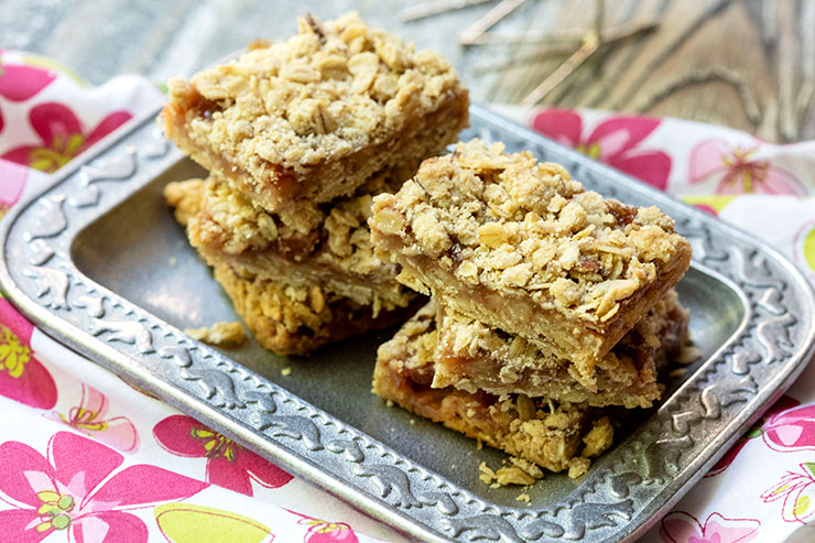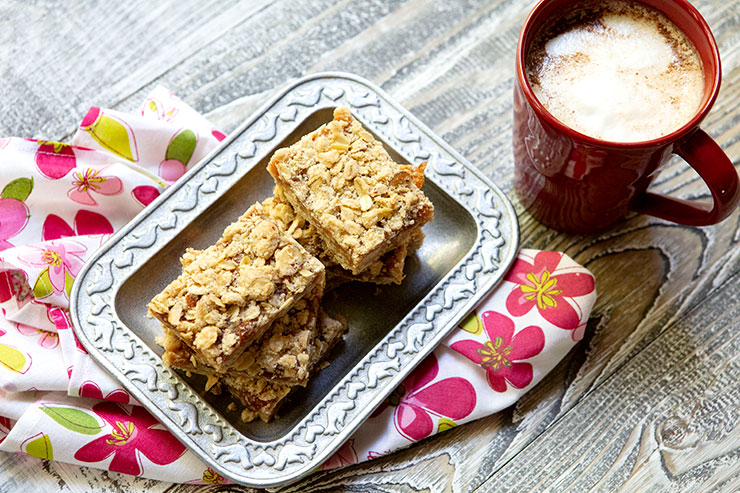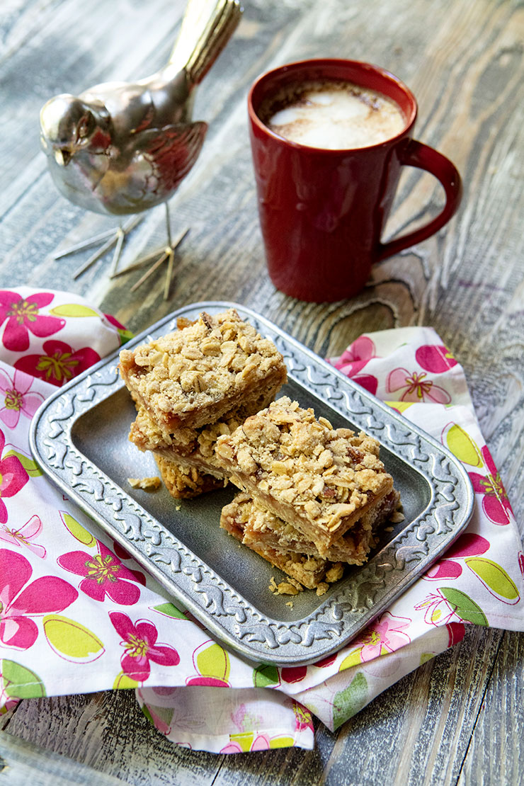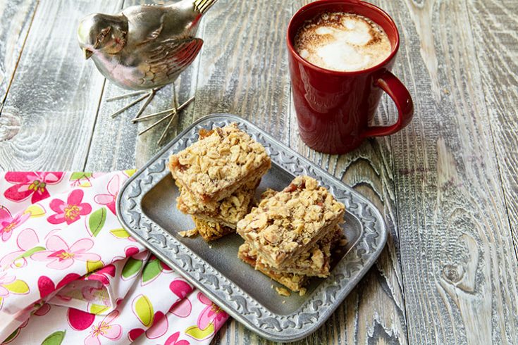 A tender bar, chock full of oats and almonds with tart rhubarb jam filling.