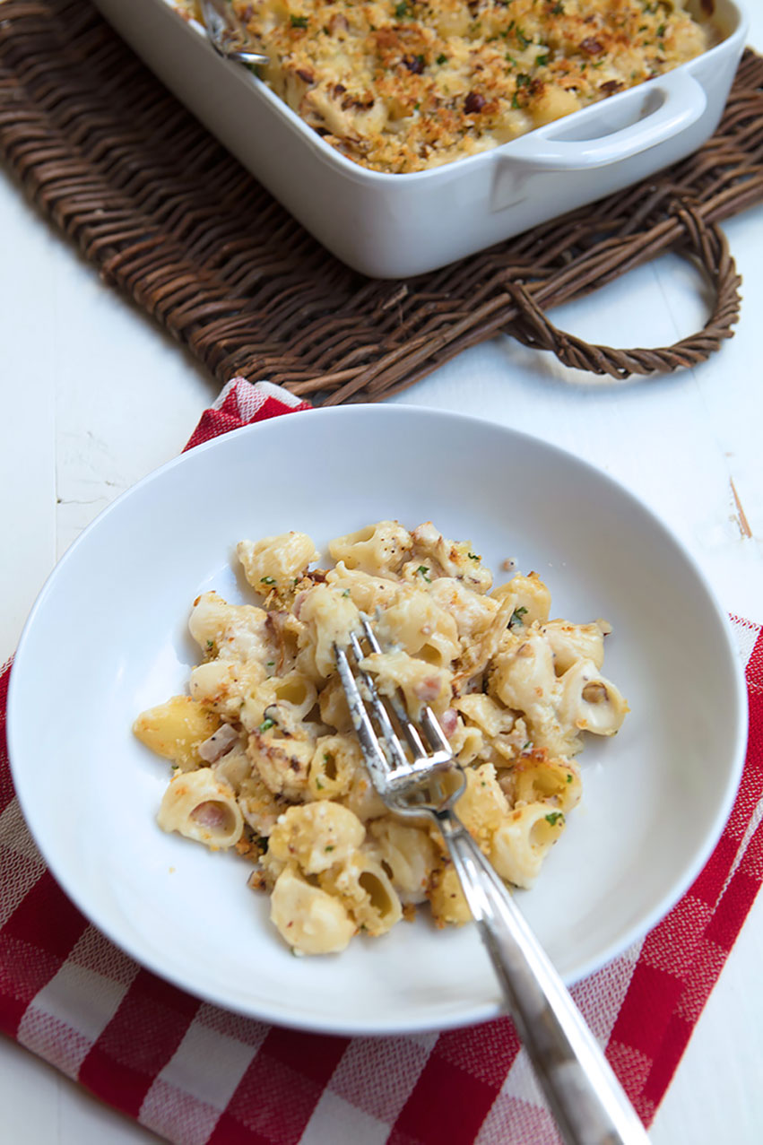 This pasta dish combines an entire head of roasted cauliflower, some tasty bacon bits, and pasta shells in a creamy, cheesy sauce that is topped with a crumb mixture flavored with even more grated cheese along with some chopped hazelnuts. The roasted cauliflower adds a subtle earthiness to the pasta that is delicious, but since the cauliflower is almost indistinguishable from the pasta once baked, it is an excellent way to encourage children to eat cauliflower without even realizing that they are doing so.