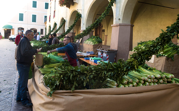 Selling black celery in the main piazza of Trevi.