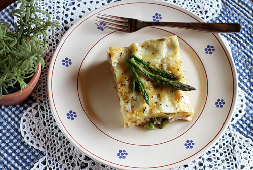 One thing I learned from living in Italy was to eat fresh, local, and seasonal ingredients whenever possible. In the spring, the vegetables that are plentiful and fresh at my local markets here in Umbria are spring peas, asparagus, fava beans, and artichokes, so I decided to celebrate these wonderful vegetables by making this light spring lasagna.