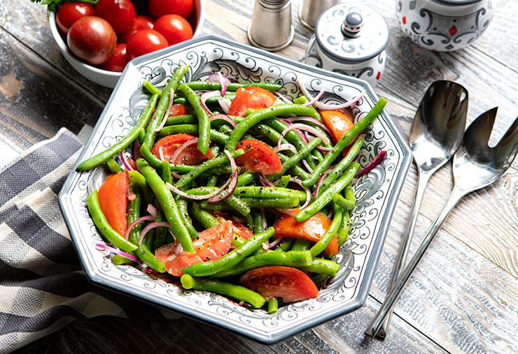 This dish pairs really well with any grilled meat, fish or poultry. You can also enjoy it on its own for a light lunch topped with a ball of fresh mozzarella, which is how my husband and I like to eat it. The trick to making this dish work is to blanch the beans just until tender-crisp, then place them in an ice-water bath to stop the cooking process. Add chunks of ripe tomatoes, thin slices of red onions, then toss everything in a vibrant dressing, and you have a fantastic summer side.