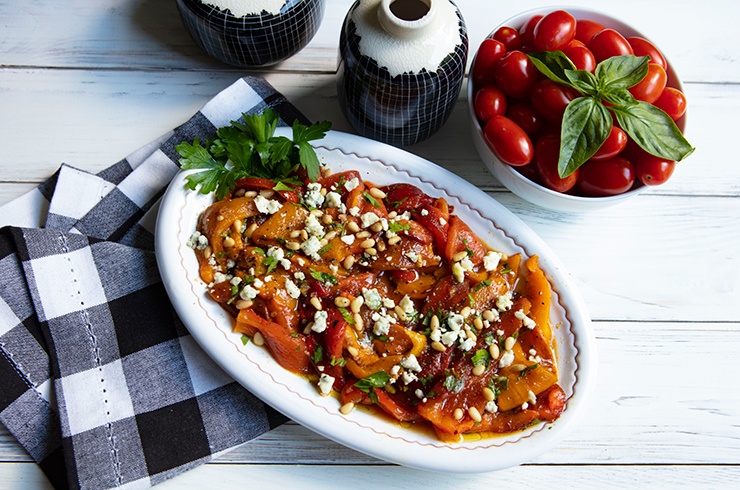 Grilled Peppers With Gorgonzola Crumbles & Pine Nuts